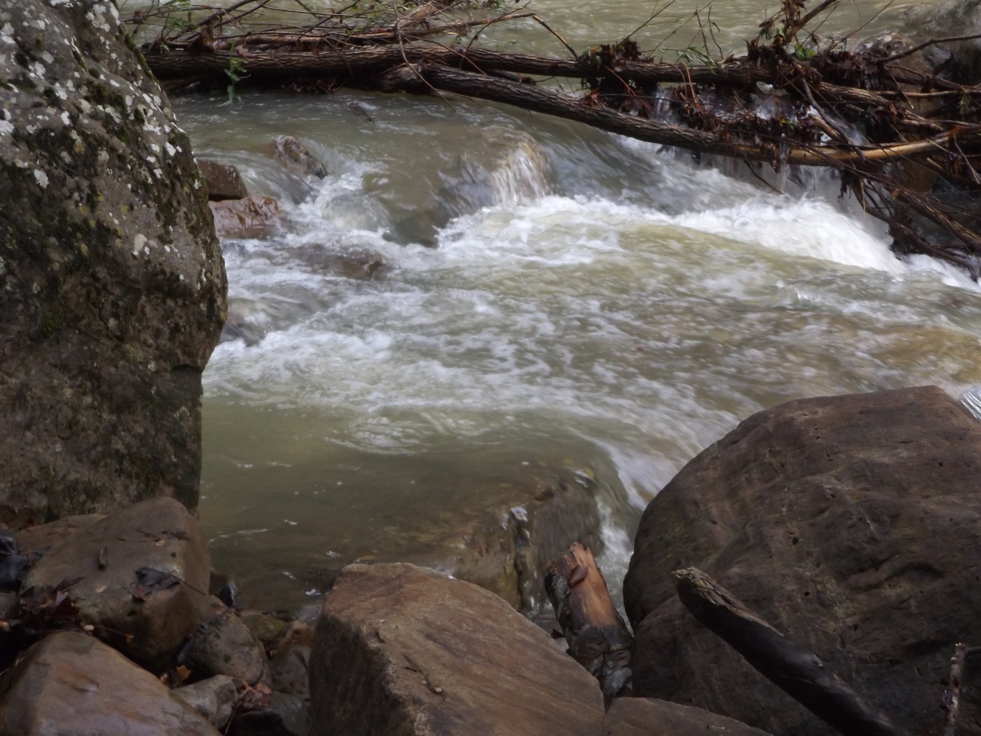 Whoo-hooo! The Creek is up! Not out of her banks , but right at it – rolling , muddy and white water! Part of our life style is living with , rather than battling , the Creek in all her moods-so after heavy rains I walk down the hill and check her out!