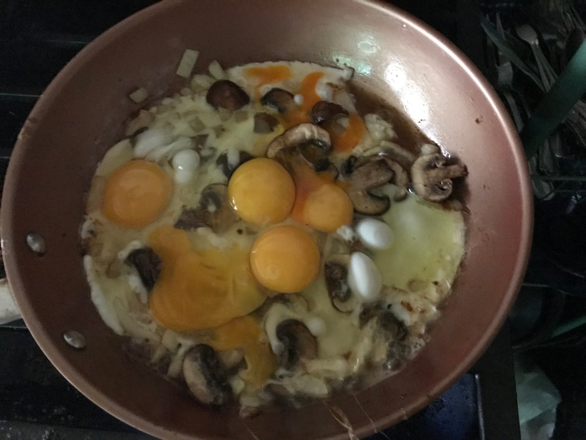 making an awesome lunch! Farm fresh eggs ( our girls run all day but are locked up at night for safety) , onions from the garden , baby bella Mushrooms and farm butter and cheese… sadly we are dryin our goatie girls up til they kid again.. They need to rebuild from the work of producing milk and have a chance to build strong healthy kids.