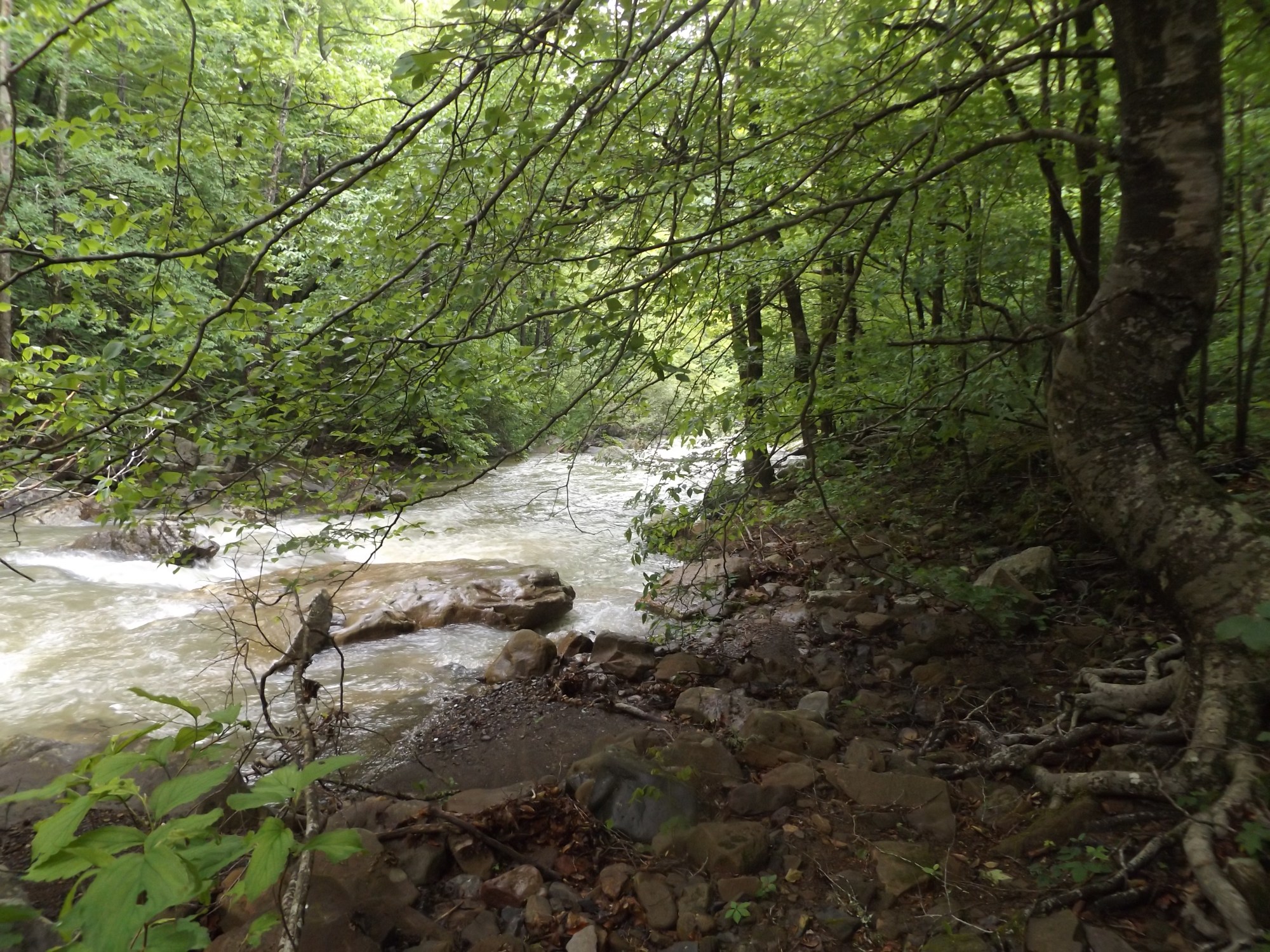 You will reach a turn out. If you are in a low-slung vehicle STOP here and hike across the creek and up to the house on top. If you have good clearance , drive on up and offload at the campsite and then park up by the water tub on top. Main driveway is to the left.